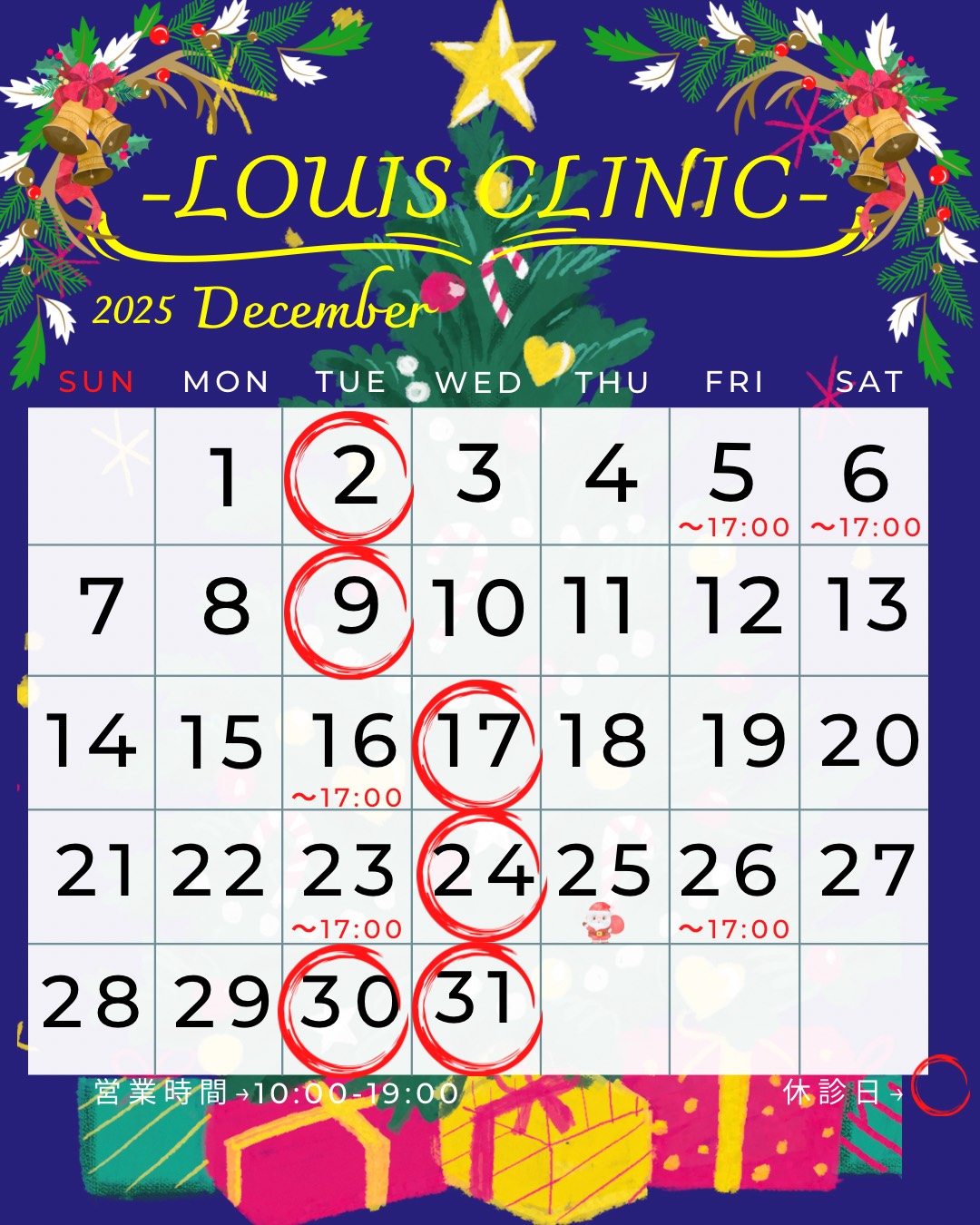 2025年12月休診日のお知らせ 2025.11.29 LOUISCLINICの2025年12月の休診日をお知らせいたします。 2025年11月休診日のお知らせ 前の記事 「名医のチョイスから取材を受けました」 次の記事
