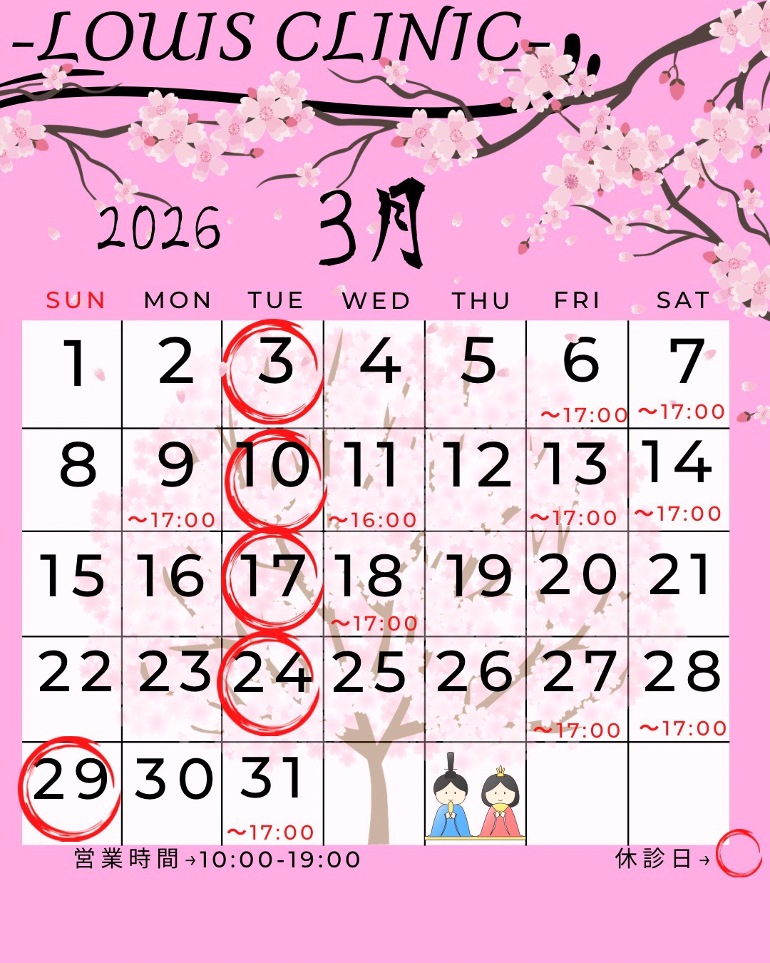 LOUISCLINICの2026年3月の休診日をお知らせいたします。